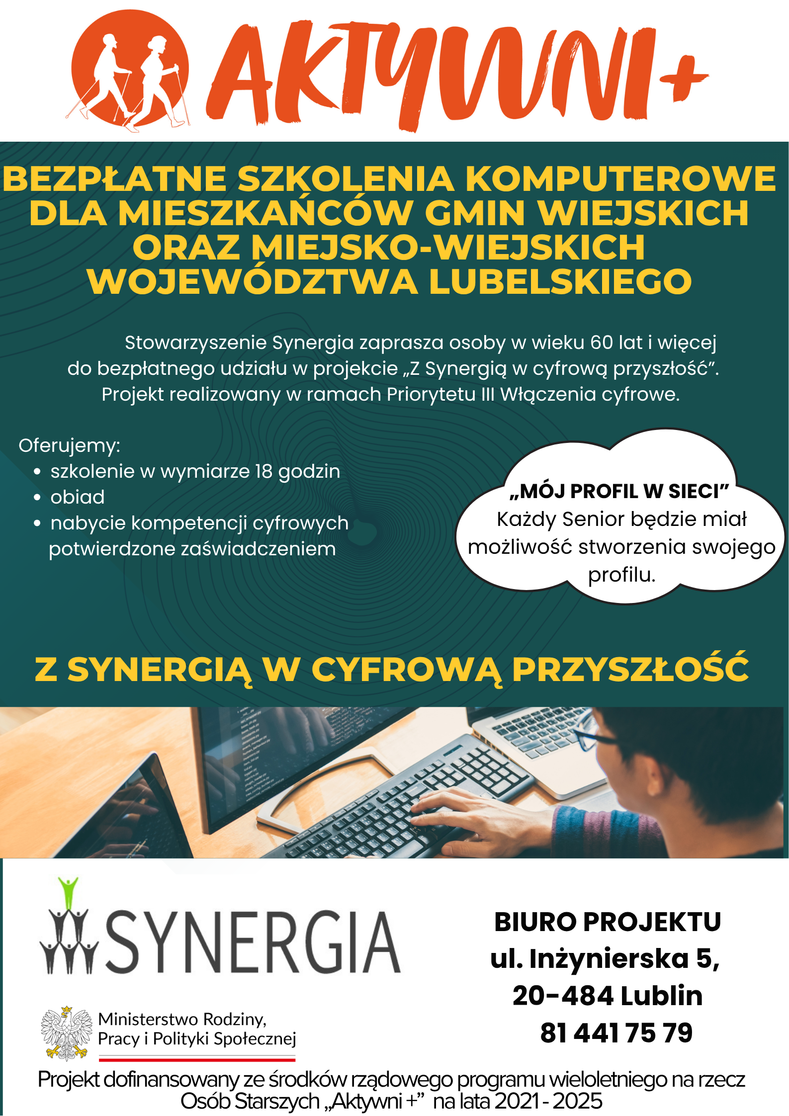 Projekt „Z Synergią w cyfrową przyszłość” realizowany jest przez Stowarzyszenie Synergia na terenie województwa lubelskiego w ramach Programu wieloletniego na rzecz Osób Starszych „Aktywni+” na lata 2021-2025 Edycja 2025, na podstawie Umowy nr 521/DC/25 podpisanej ze Skarbem Państwa – Kancelarią Prezesa Rady Ministrów z siedzibą w Warszawie, Al. Ujazdowskie 1/3, 00-583 Warszawa.
